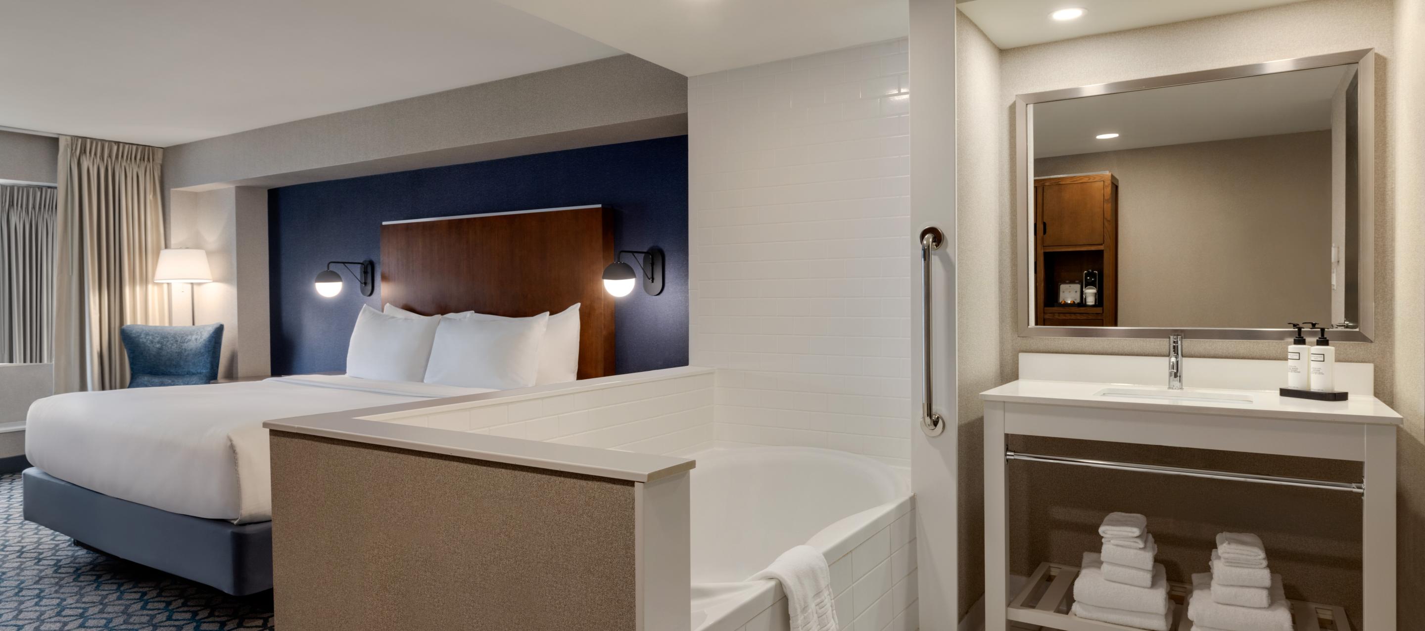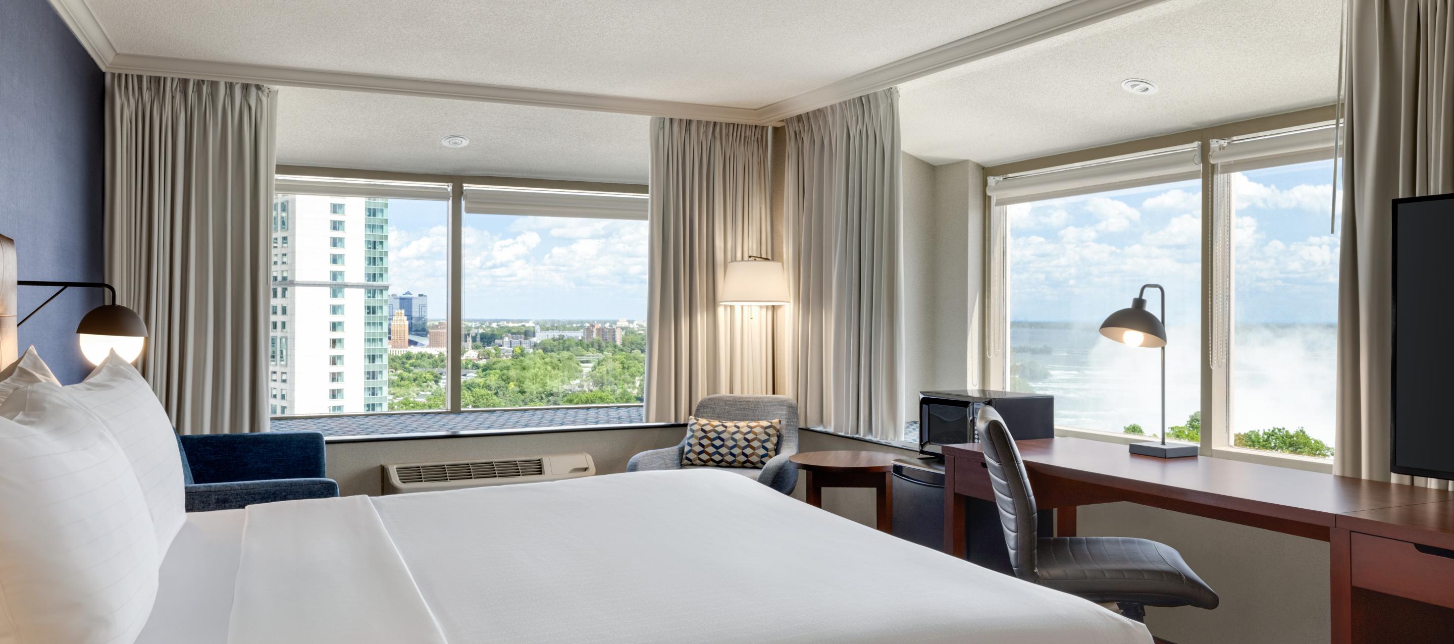 The Wyndham Grand Fallsview Hotel offers a perfect blend of luxury, comfort, and convenience. The hotel has direct access to Fallsview Casino through an indoor walkway and is just steps away from the Niagara Falls Convention Centre. Guests can enjoy free high-speed Wi-Fi, a luxurious indoor pool, and a modern fitness center. Savour world-class dining at Ruth’s Chris Steak House, known for its premium steaks and elegant atmosphere, or The Keg Steakhouse & Bar, a Canadian favourite offering expertly grilled steaks and a warm, inviting setting. Grab a handcrafted beverage at Starbucks or enjoy casual bites at TGI Fridays, all located on-site. For top-tier entertainment, the hotel features Yuk Yuk's Comedy Club and the exciting Niagara Falls Fun Zone, offering an unforgettable stay in the heart of Niagara Falls.